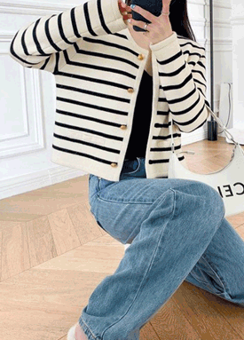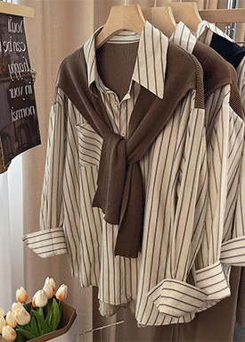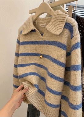 [당일발송]스트라이프 오픈카라 긴팔 니트