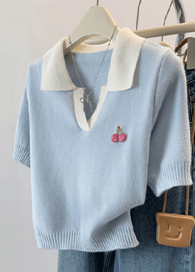 [당일발송]연블루 체리 반팔 카라 니트[여름 원단]