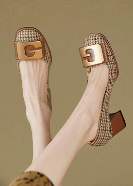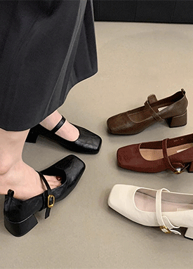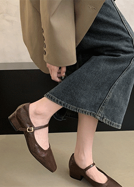 스퀘어 셔링 레더 펌프스 힐