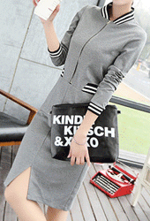 스트라이프 포인트배색 집업 슬림 원피스