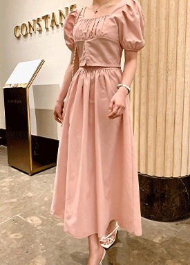 퍼프소매 스퀘어넥 A라인 플레어 투피스