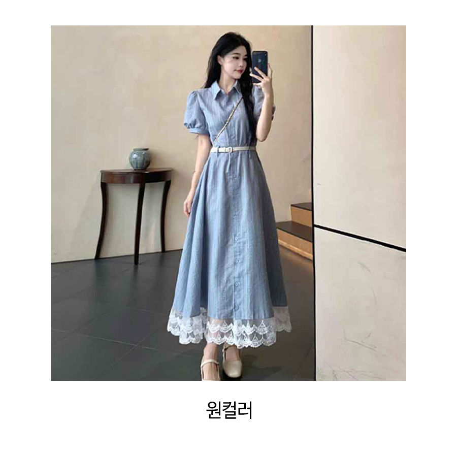 182456 스카이 블루 레이스 패치 퍼프 롱 원피스[벨트포함 벨트 디자인 변경 상세페이지 참고해주세요] 30580