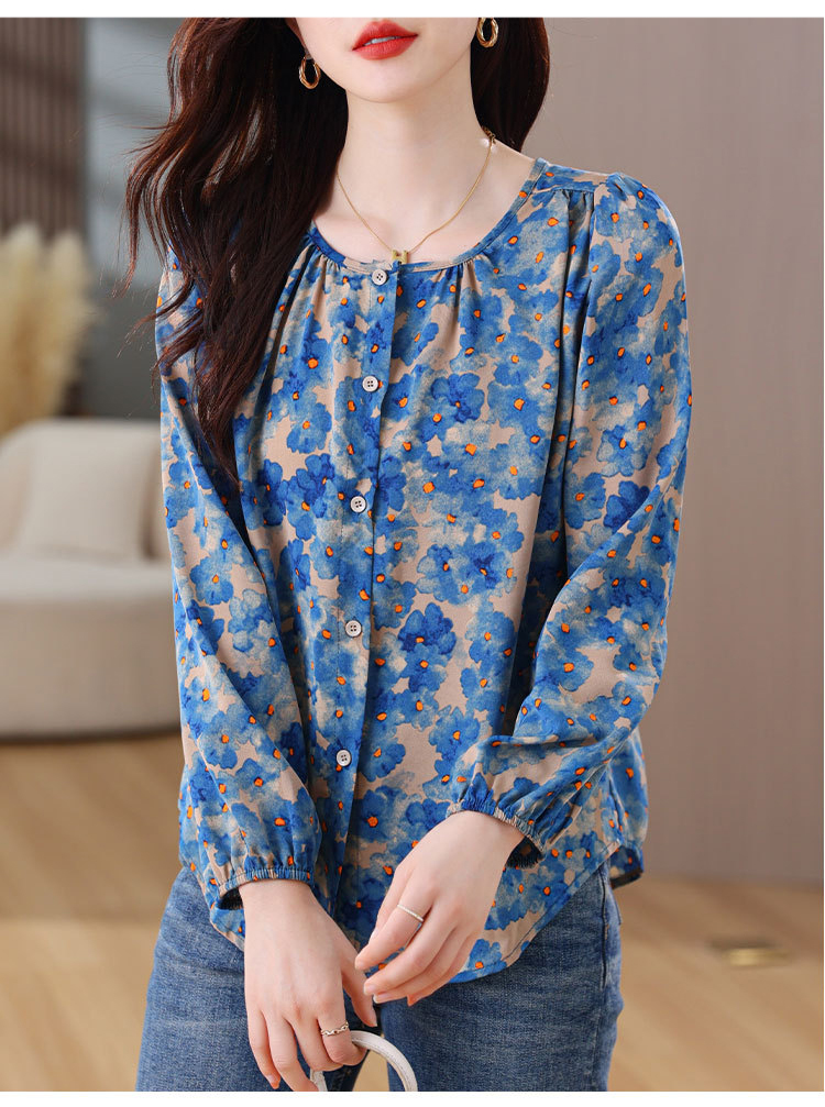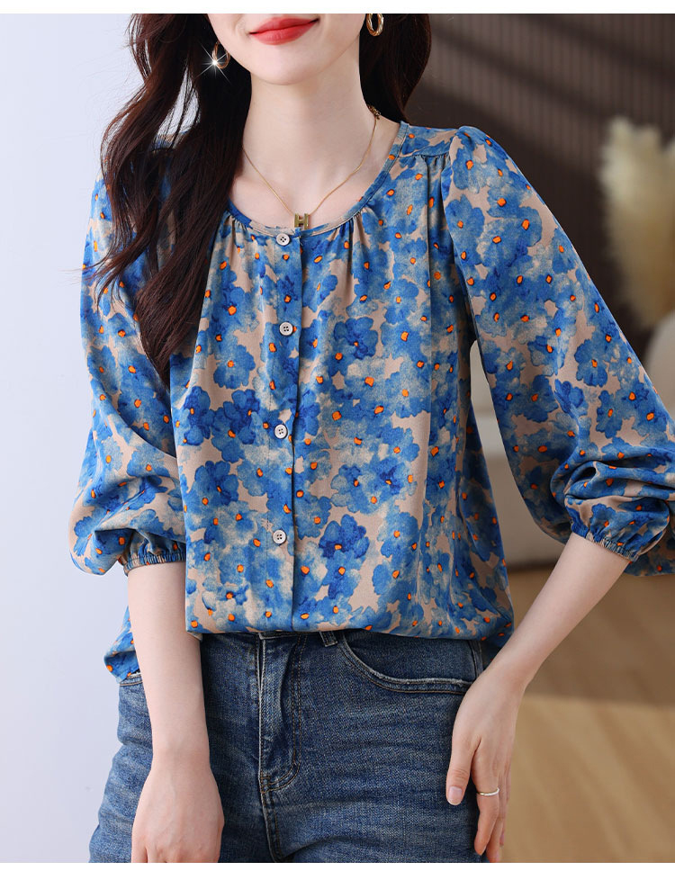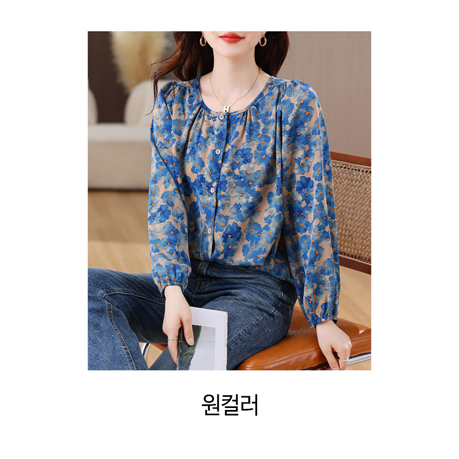 블루 플라워 패턴 블라우스