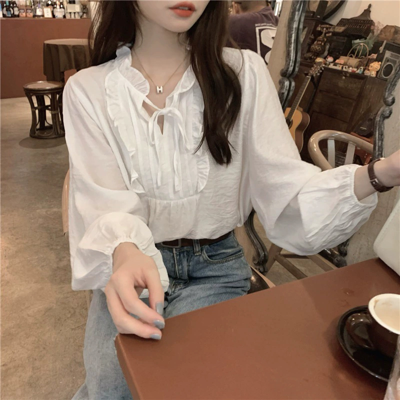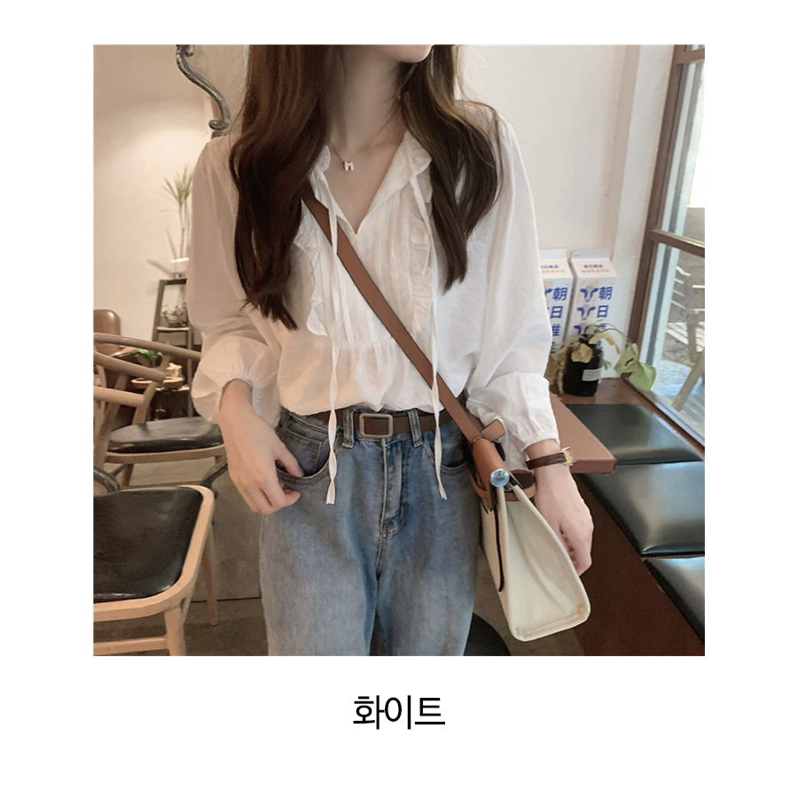 리본끈 화이트 프릴넥 블라우스