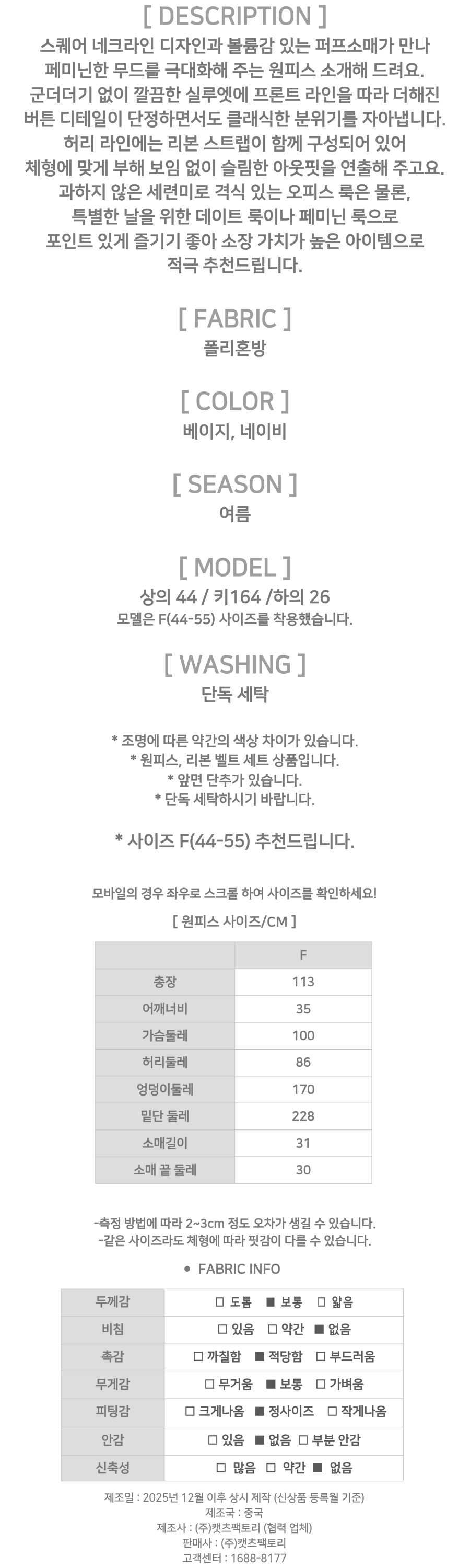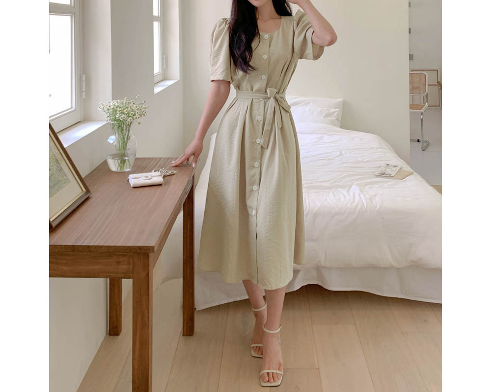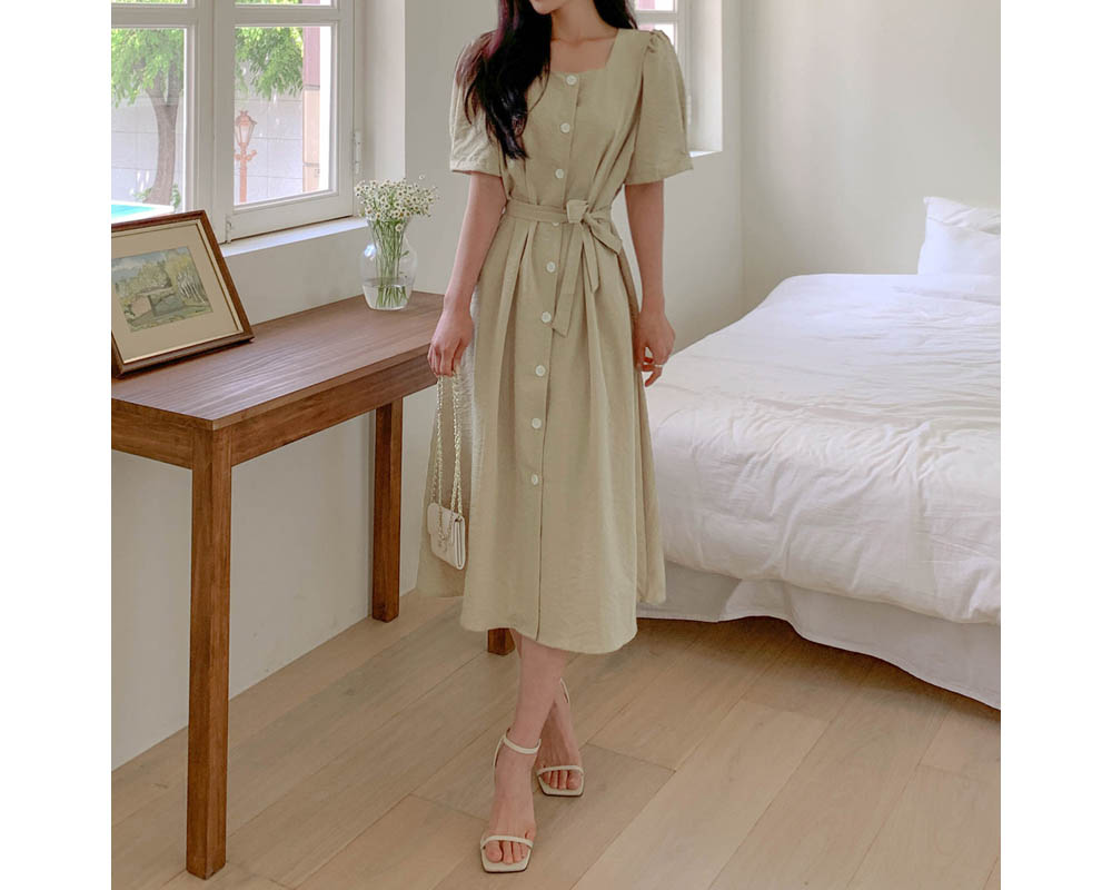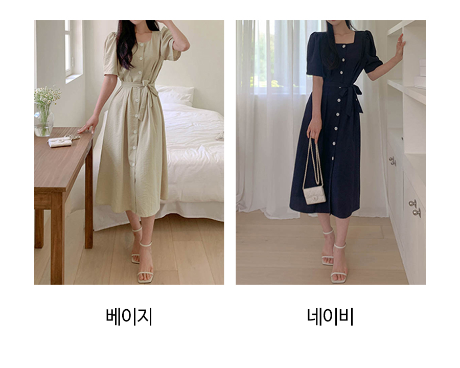 182583 페미닌 스퀘어넥 퍼프 버튼 원피스 37480