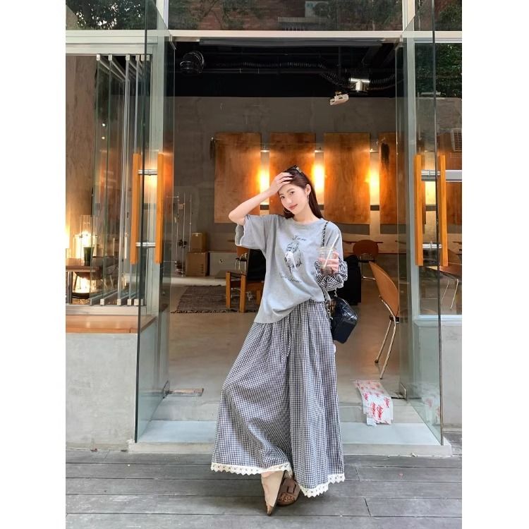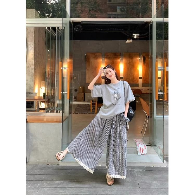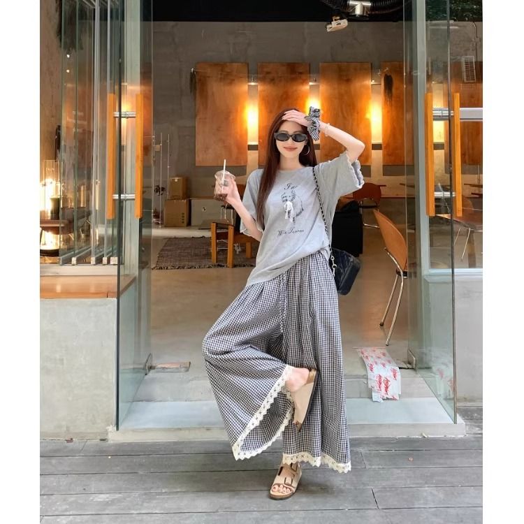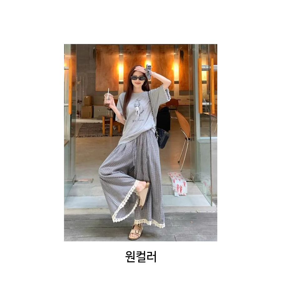 .레이스 포인트 티셔츠&체크 팬츠&헤어밴드 2SET
