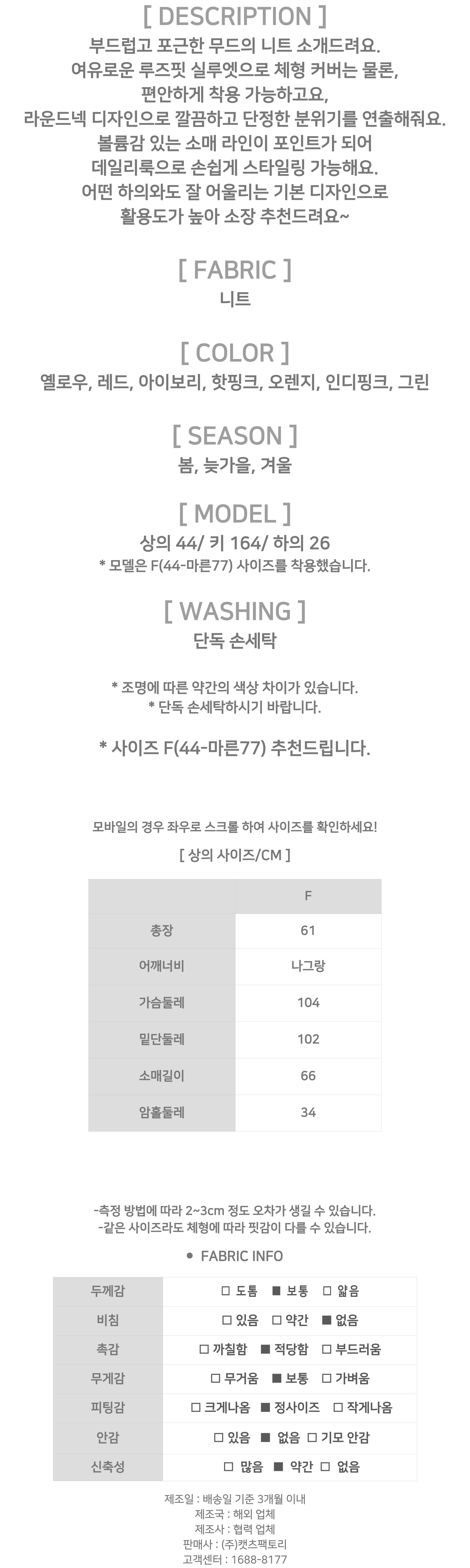 - 상품의 색상은 사용하시는 모니터 사양에 따라 실제 색상과 다소 차이가 있을 수 있으며, 이는 불량의 사유가 되지 않습니다.