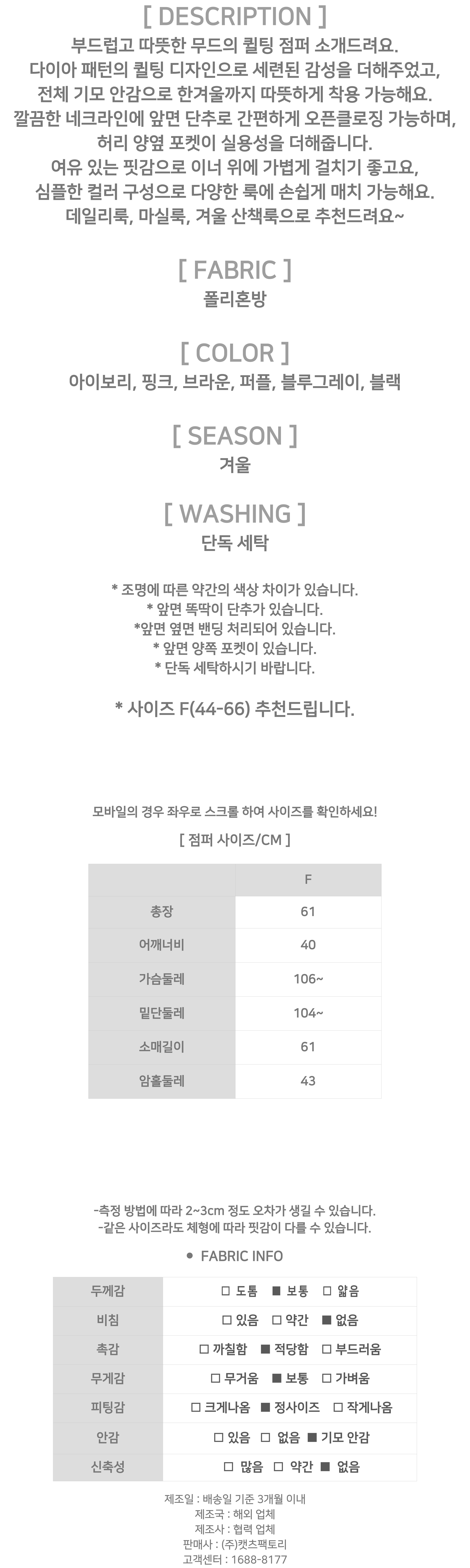 다이아 퀼팅 겨울 기모 점퍼