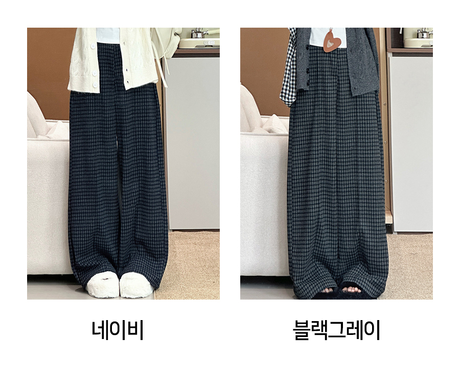 체크 와이드 뒷 밴딩 팬츠