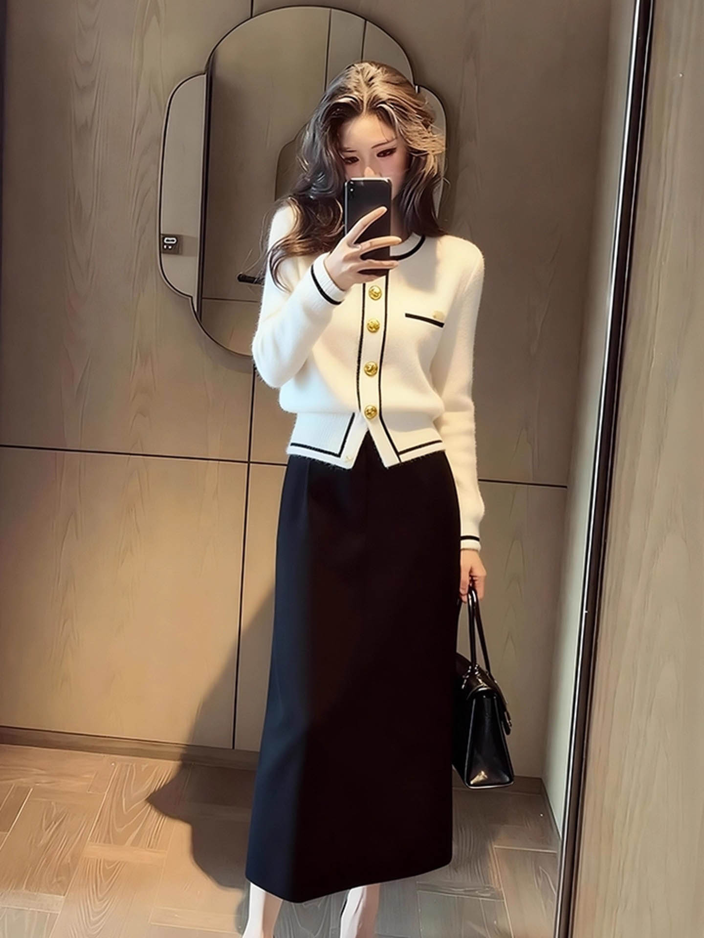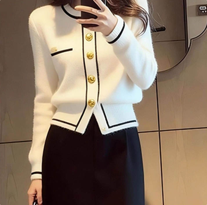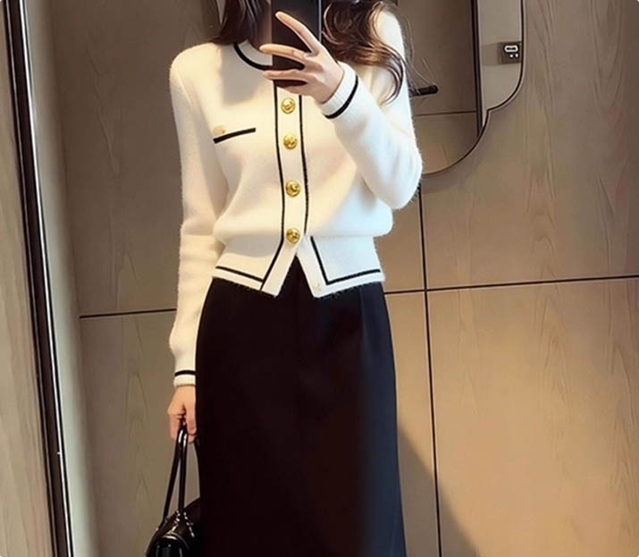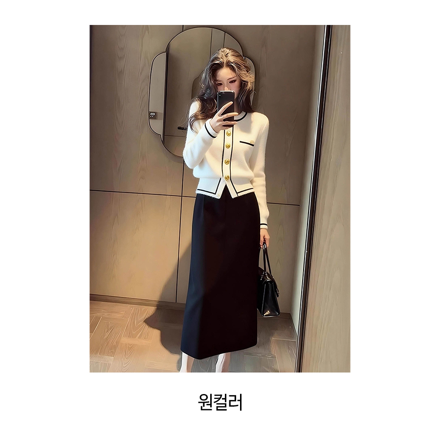 클래식 금장 니트 가디건&H라인 스커트 세트