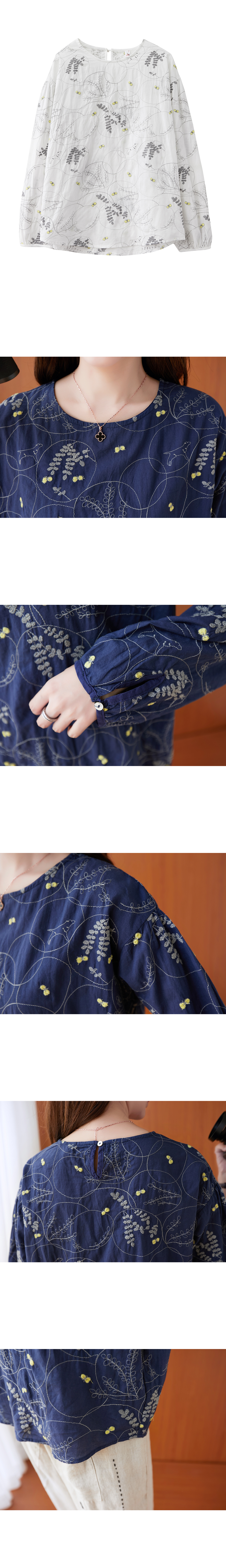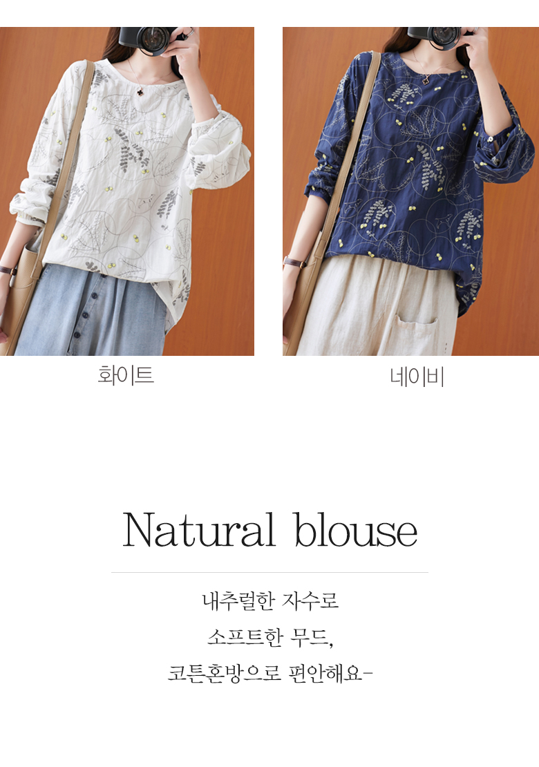 잔잔한 자수를 넣어 내추럴한 블라우스 만나보세요. 은은하고 꼼꼼하게 들어간 자수로 여리 여리하게 코디하기 좋은 코튼혼방 블라우스에요:) 낙낙한 핏과 부드럽고 가벼운 코튼혼방 소재로 봄, 가을 쾌적하고 편안하게 착용하기 좋으실 거에요~ 전체적으로 부담스럽지 않은 자수가 들어가 팬츠, 스커트와 관게없이 내추럴하면서 여성스러운 스타일링이 가능하구요, 밑단 라운드형으로 꺼내입어도 어색하지 않고, 하의에 넣어입으면 깔끔하게 코디가 가능해요:) 소매 라인도 살짝 볼륨을 잡아 입체감있게 떨어지는 핏이 예쁘답니다! 라운드넥으로 얼굴선을 부드럽게 잡아주고, 넥라인 위쪽으로 단추를 넣어 입고 벗기도 간편한 제품이에요~ 화이트, 네이비 2컬러 각기 다른 느낌으로 활용도 높구요, 4가지 사이즈로 55부터 88사이즈까지 편하게 입기 좋으실 거에요~ 여성스럽고 편안하게 입기 좋아 단독으로, 레이어드용으로 자주 입게되는 제품이라 꼭 소장하셨으면 해요:) *네이비 색상은 물빠짐이 있으므로 단독 세탁하시기 바랍니다. *화이트 색상은 비침이 있으므로 이너와 함꼐 착용 바랍니다. *뒷면에 버튼이 있습니다. *소매 부분에 버튼이 있습니다. FABRIC : 코튼혼방 COLOR : 화이트, 네이비 SEASON : 늦봄, 초가을 [ 모델 정보 ] 사이즈 55 / 키 163 / 바지 27 *모델은 M(44) 사이즈를 착용했습니다. [ MD 정보 ] 사이즈 55 / 키 165 / 바지 27 *MD는 L(55) 사이즈를 착용했습니다. [ WASHING ] 단독 손세탁 / 찬물 세탁 / 세탁기 가능