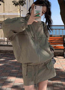 .집업 하이넥 루즈핏 점퍼&카고 밴딩 미니스커트 2SET