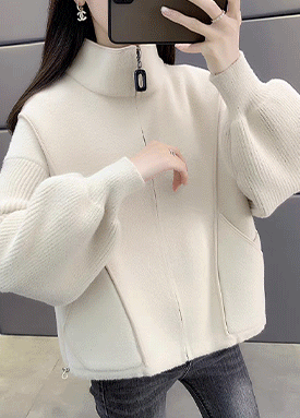 하이넥 니트소매 집업 자켓