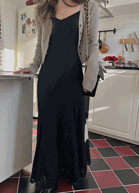 ◈[당일발송] 자수 패턴 브이넥 끈 나시 롱 원피스