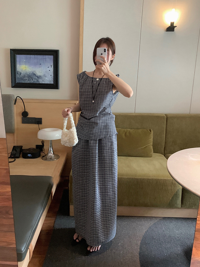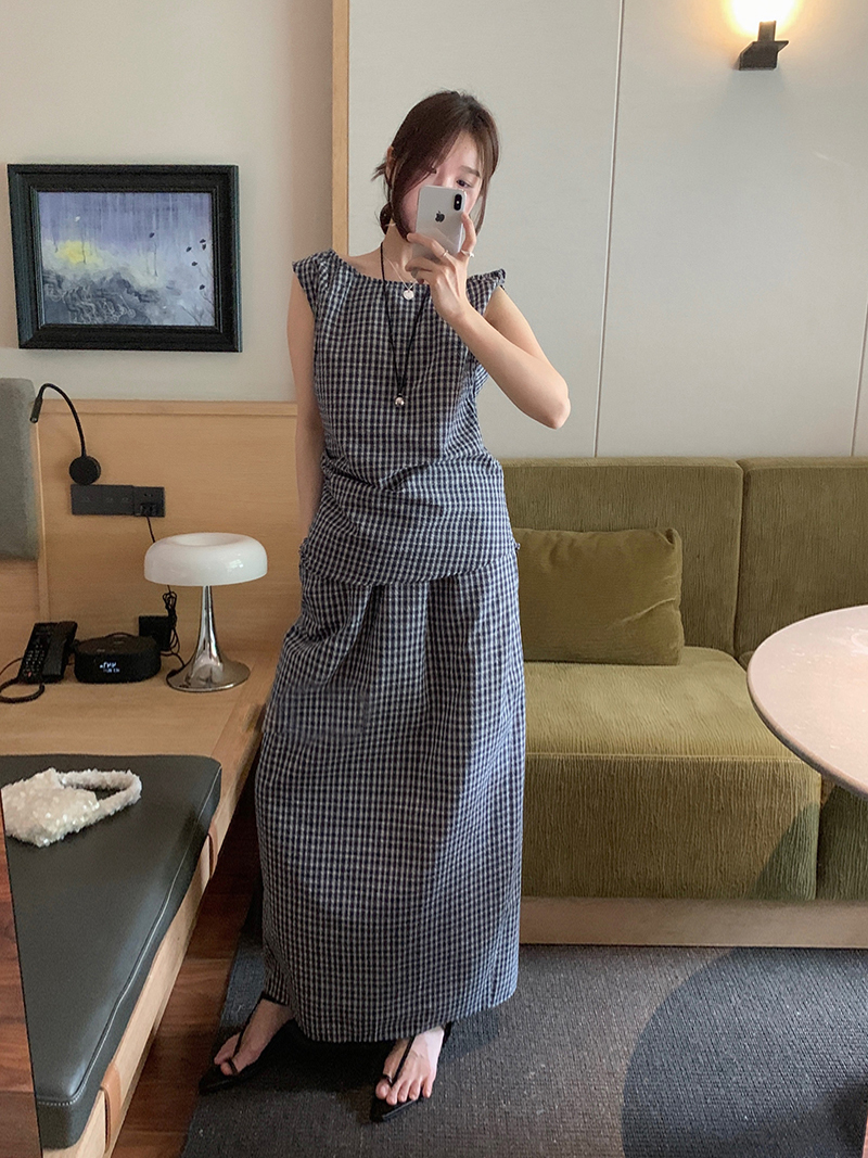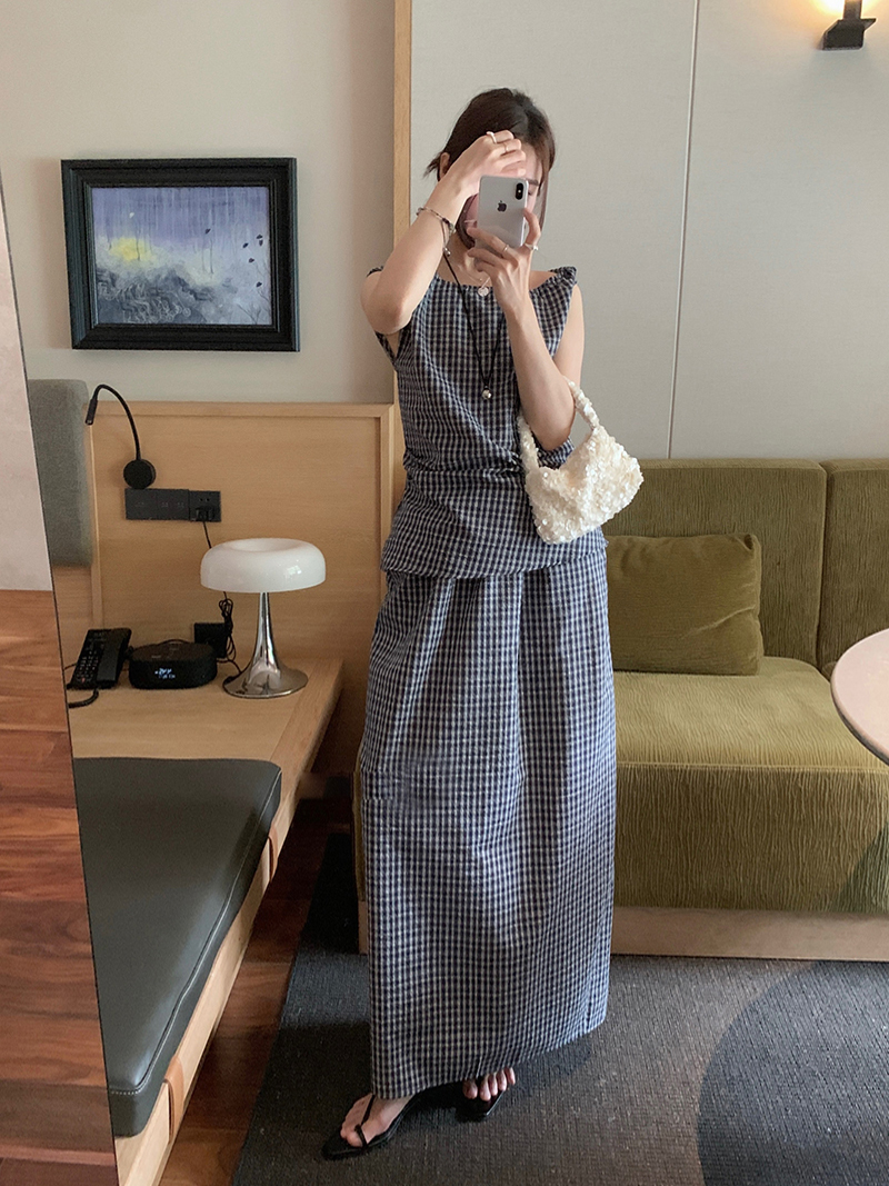 179373 ◈[당일발송] 잔 체크 민소매&밴딩 롱 스커트 2SET 52590