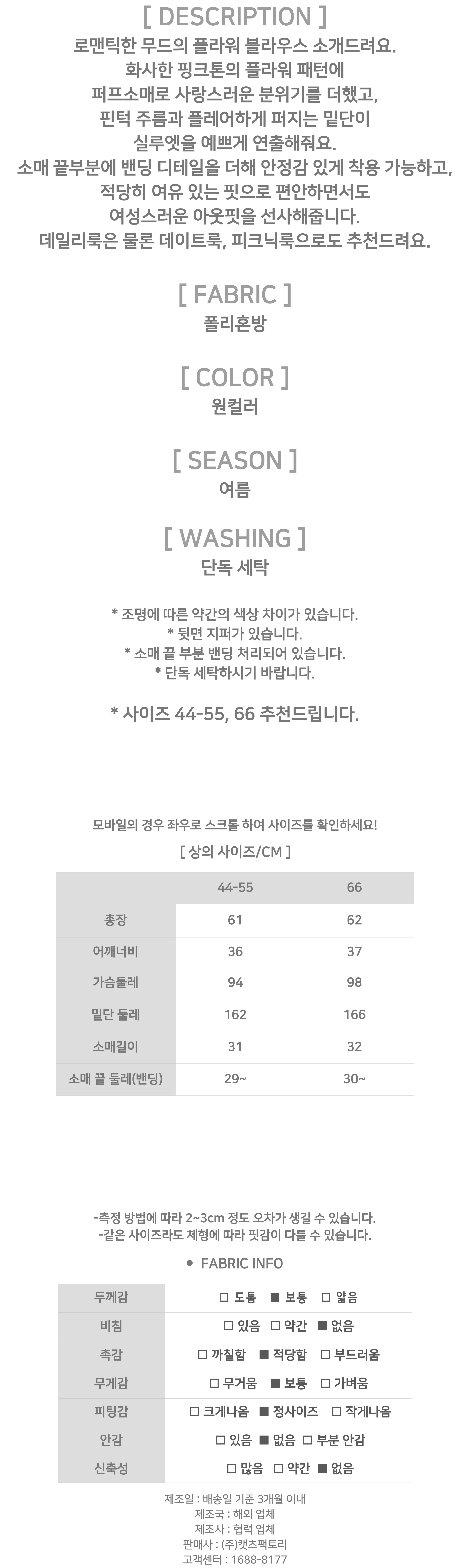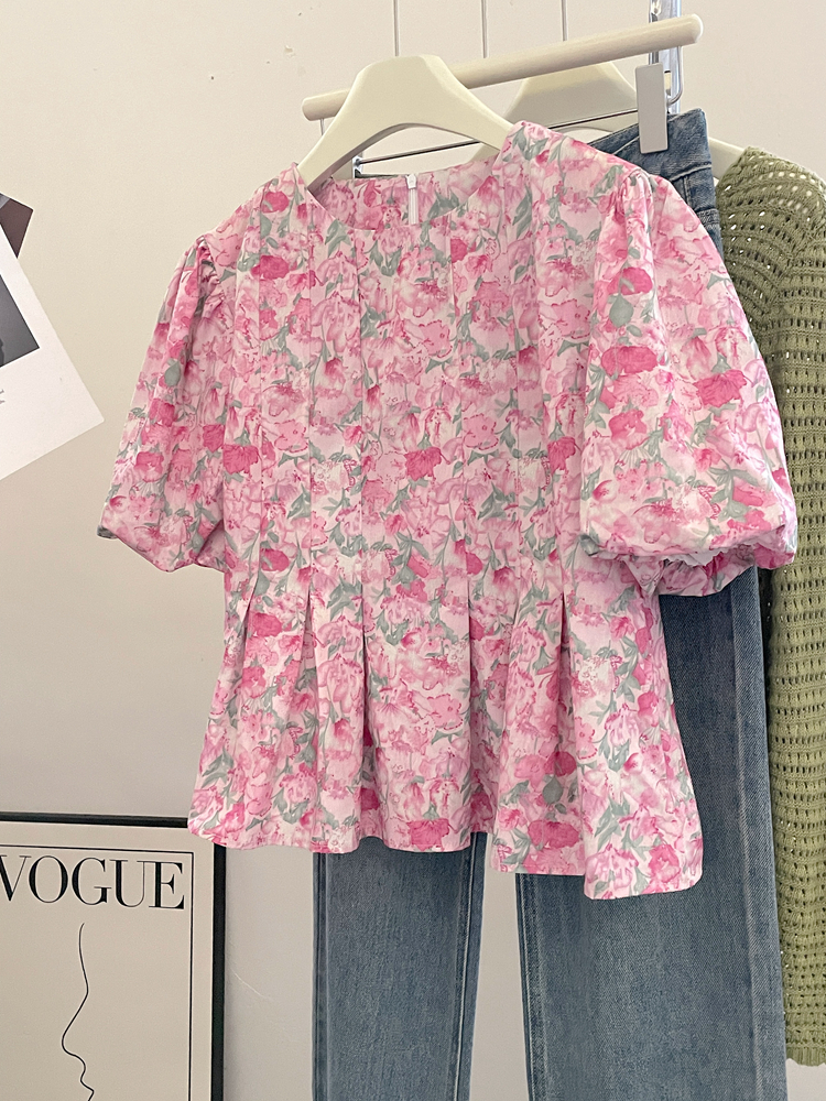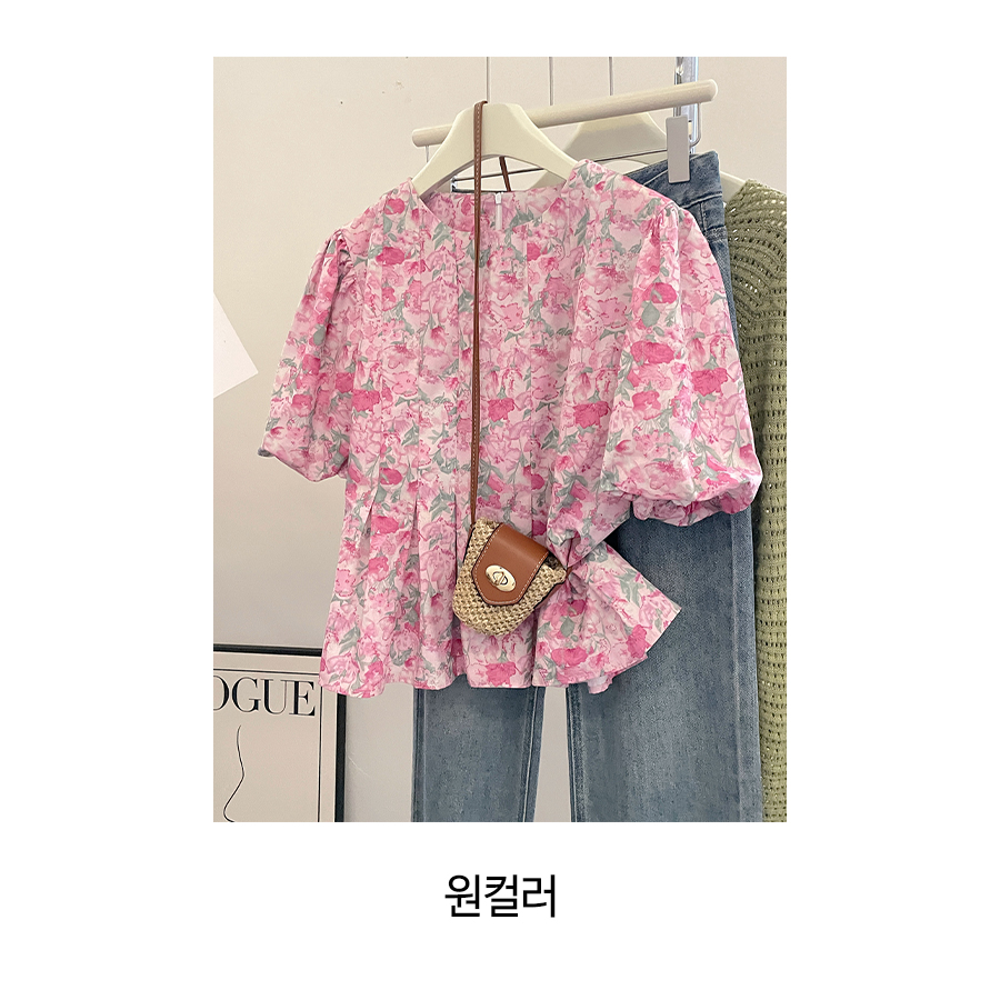 ◈[당일발송] 핑크 플라워 핀턱 퍼프 블라우스