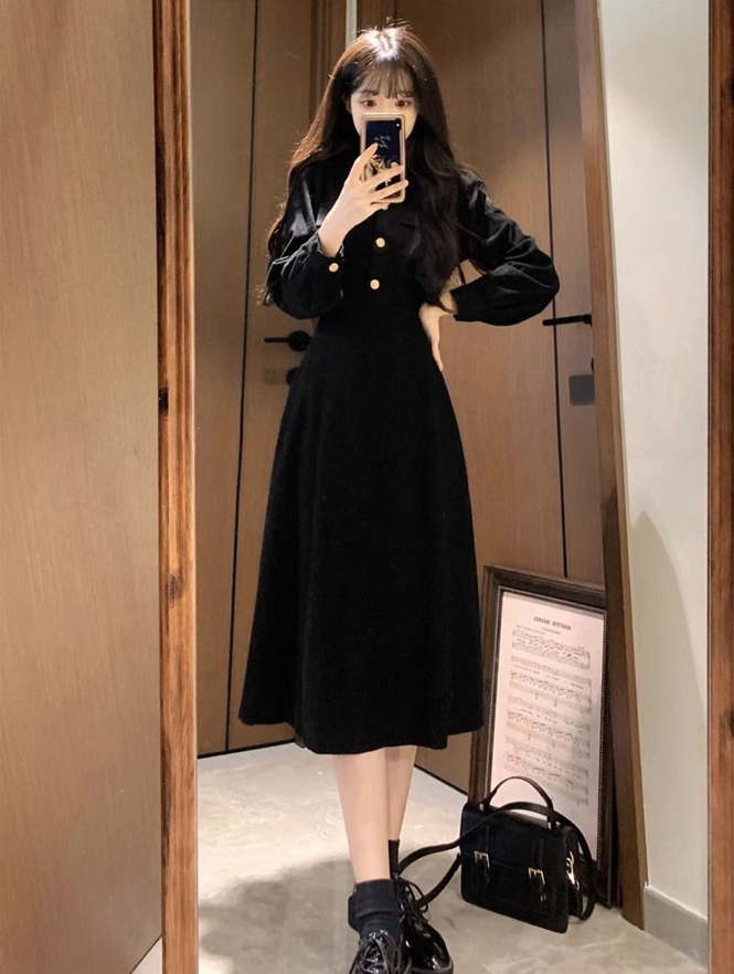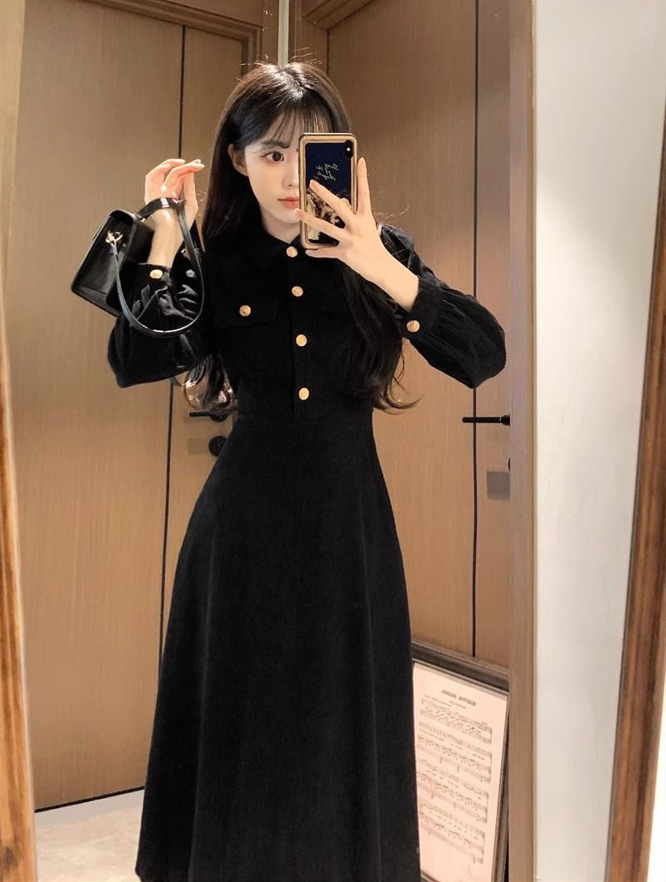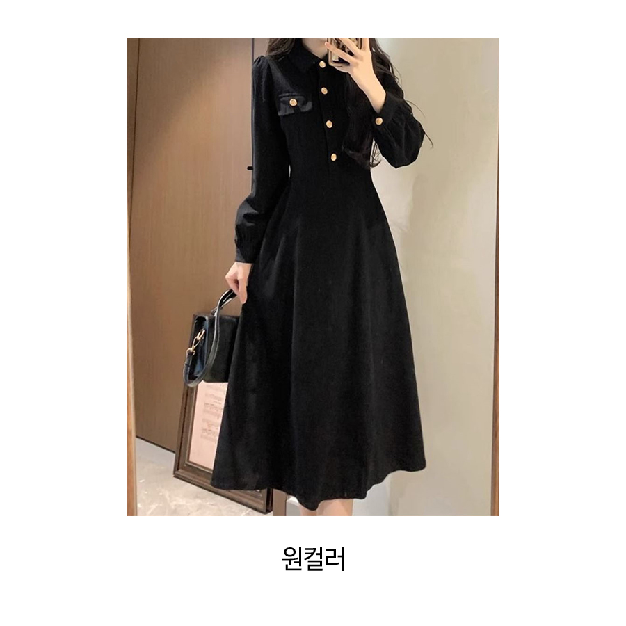 블랙 코듀로이 금장 카라 원피스