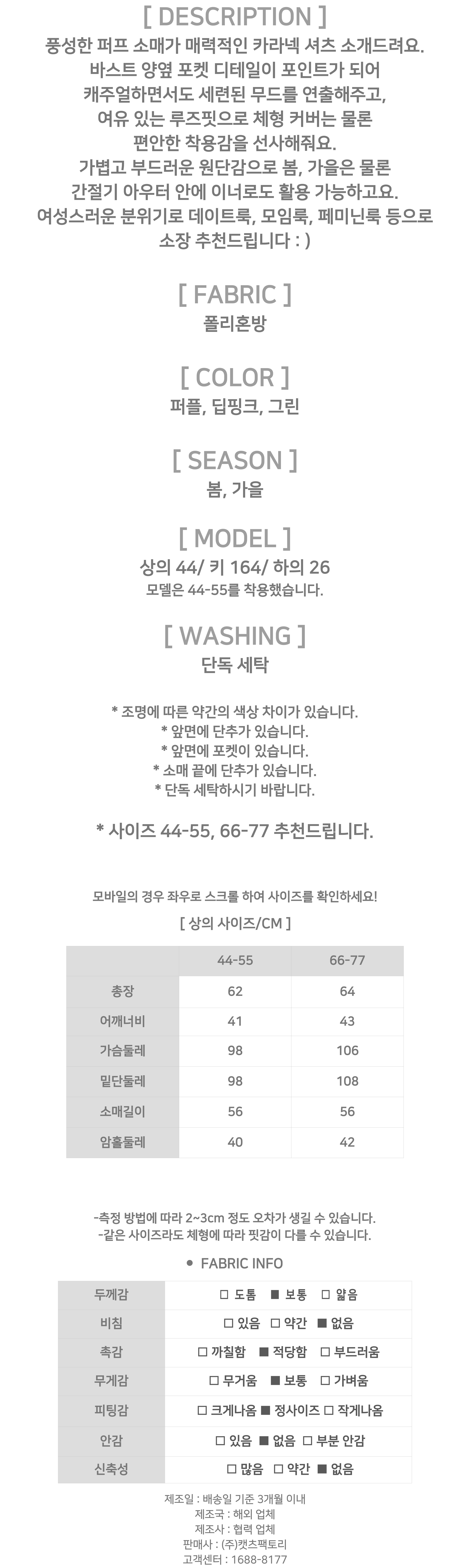 [당일발송]페미닌 퍼프 포켓 카라 셔츠