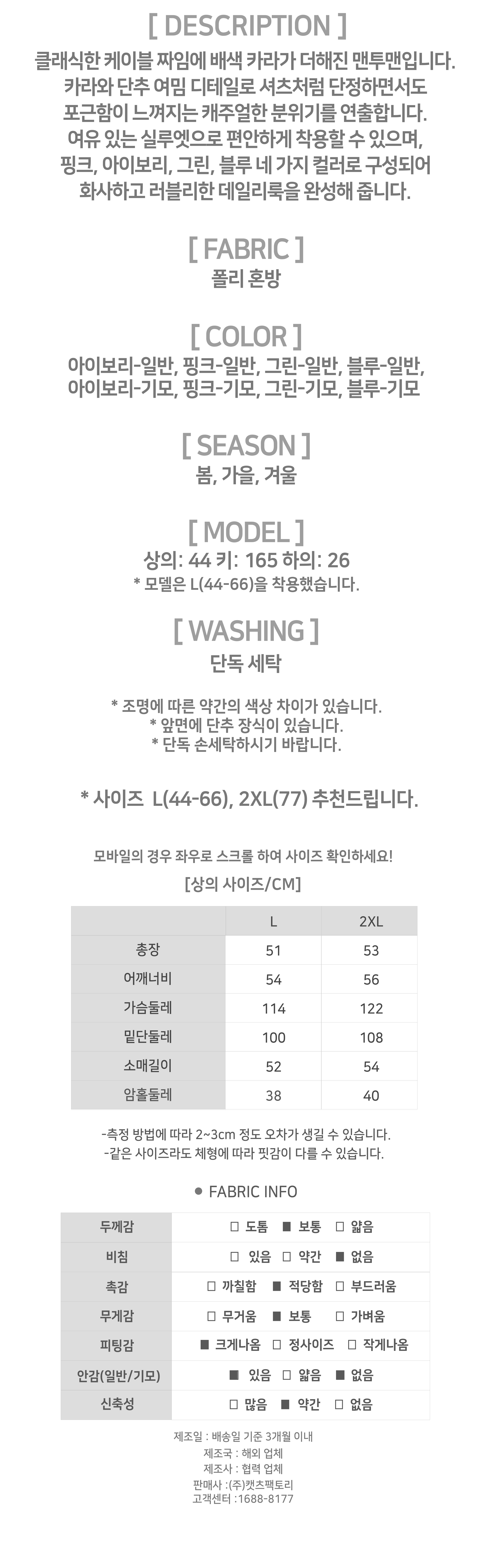 배색 카라 케이블 맨투맨[일반/기모 2종류]