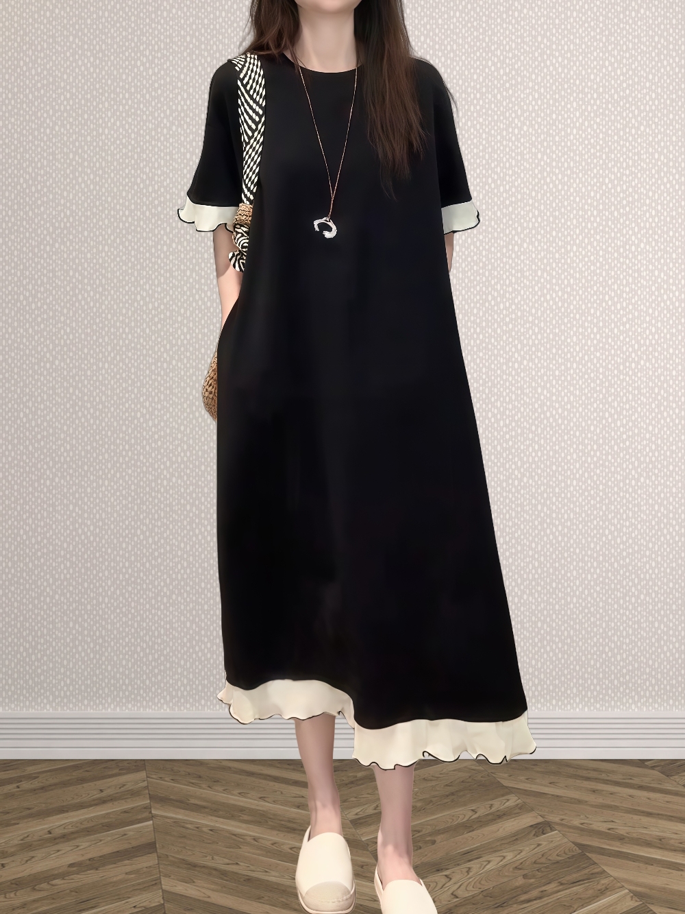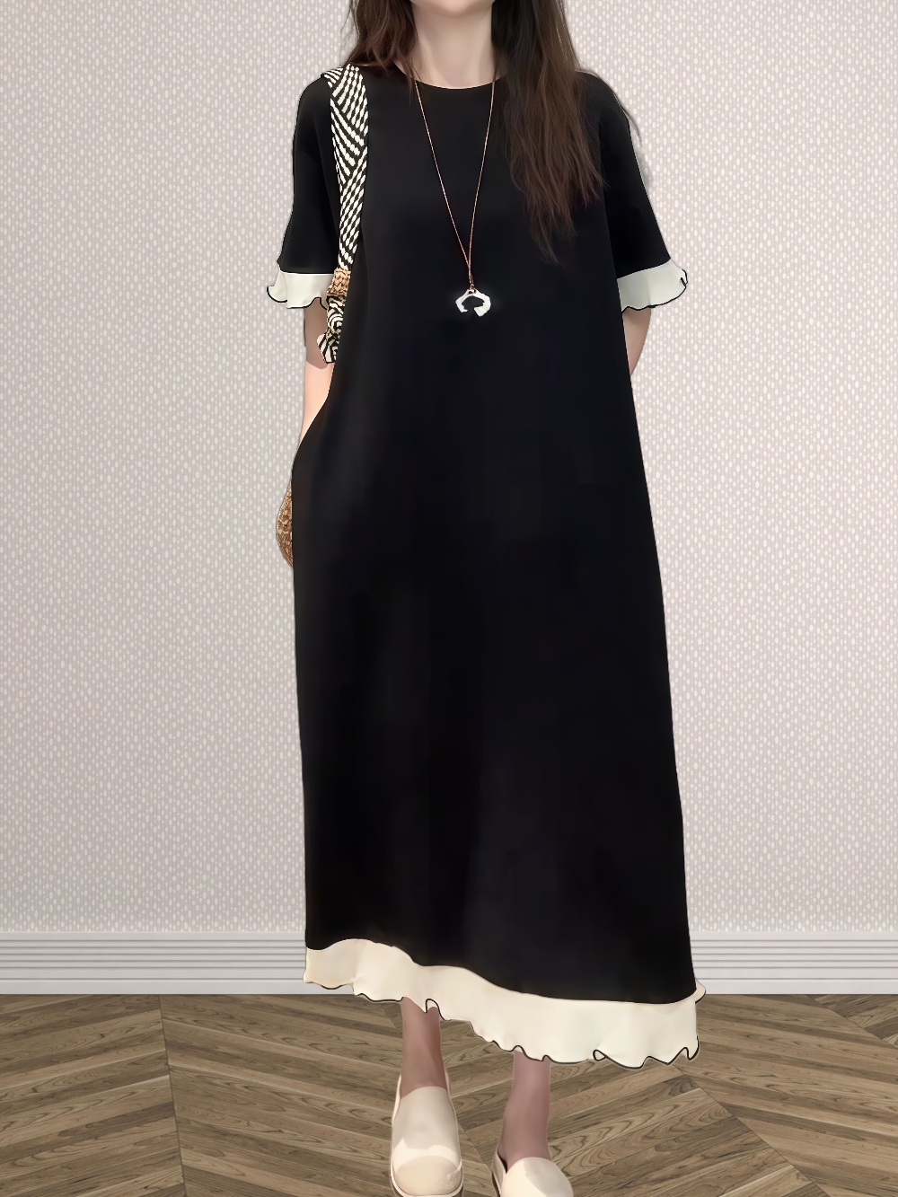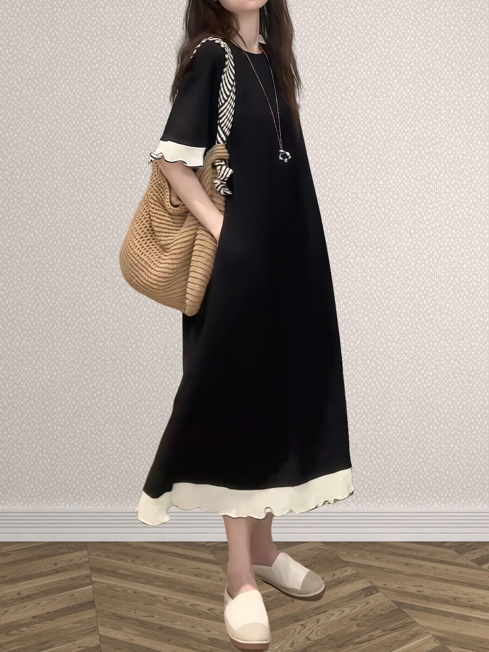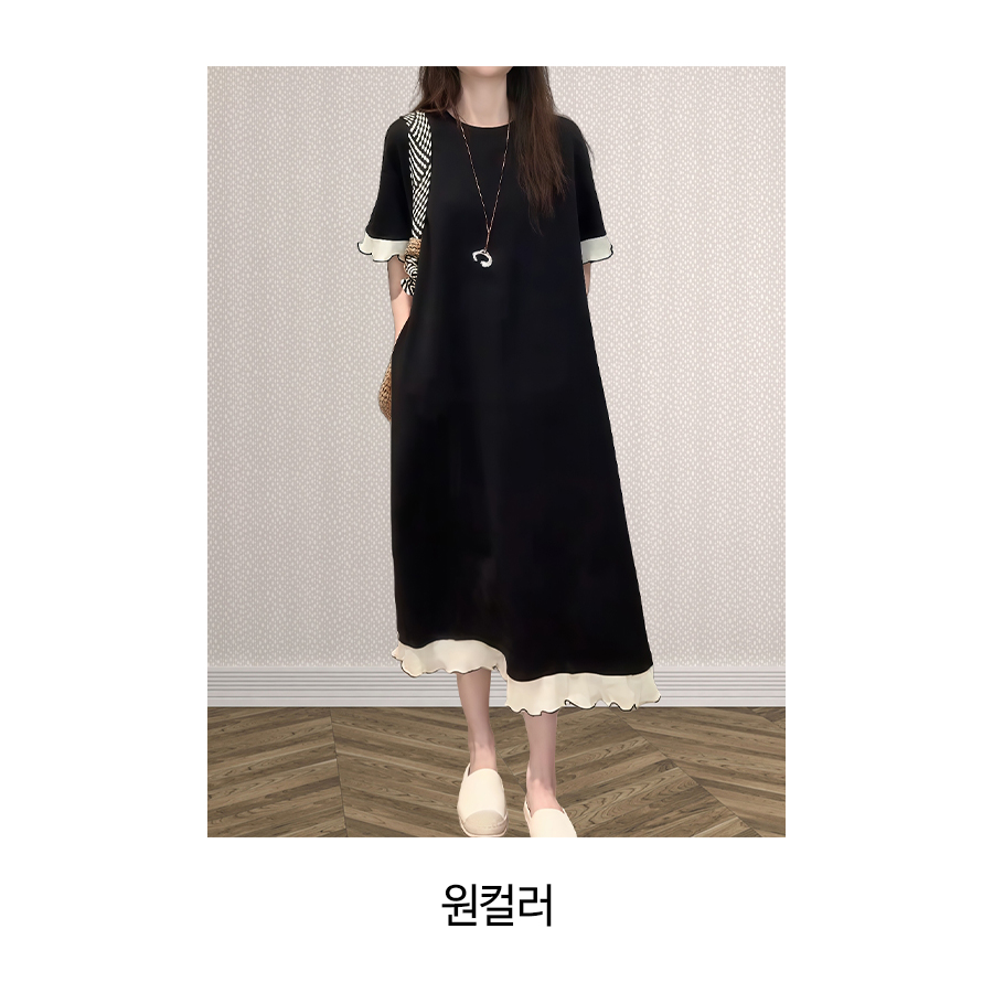 ◈[당일발송] 배색 A라인 반팔 원피스