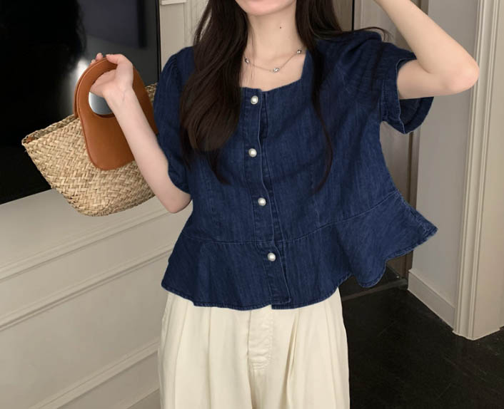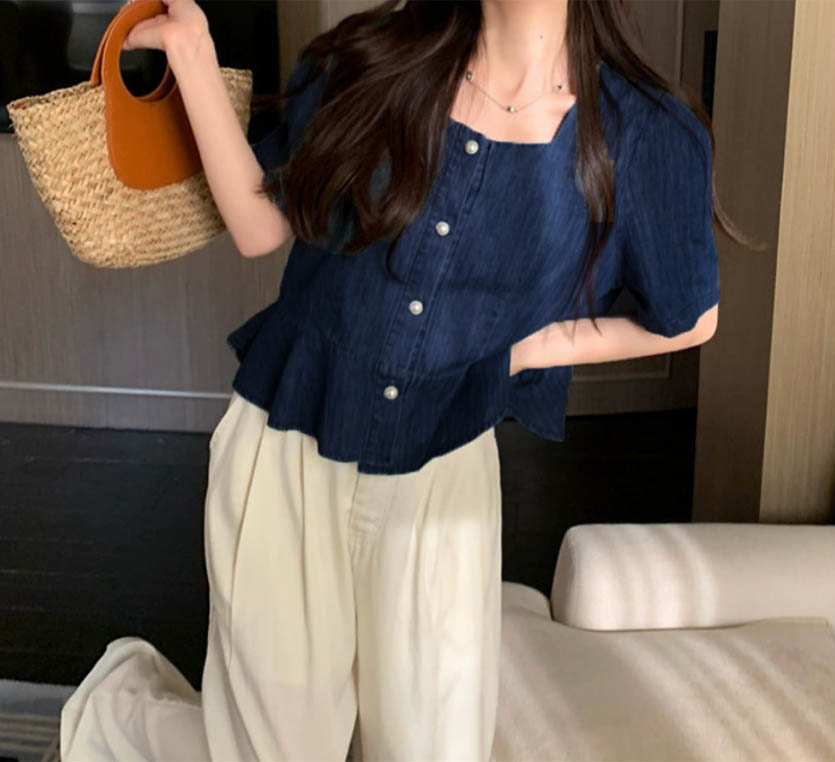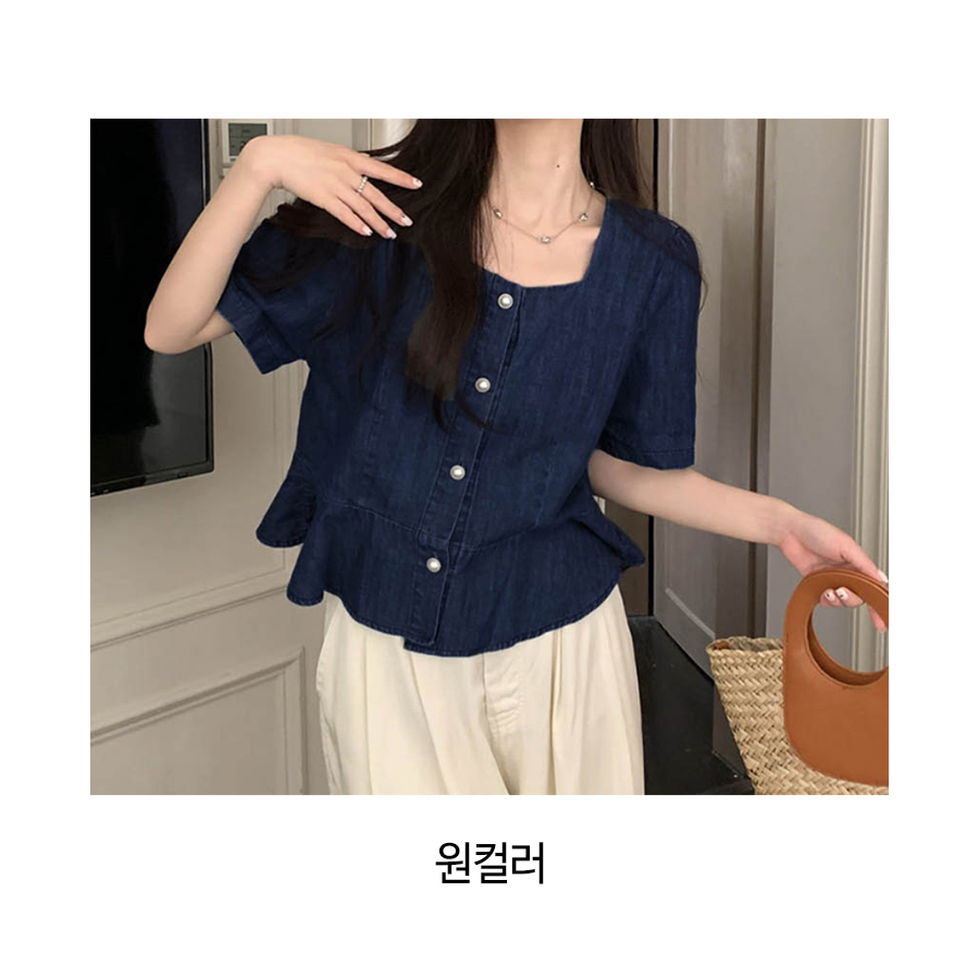 ◈[당일발송] 진주 버튼 프릴 데님 블라우스