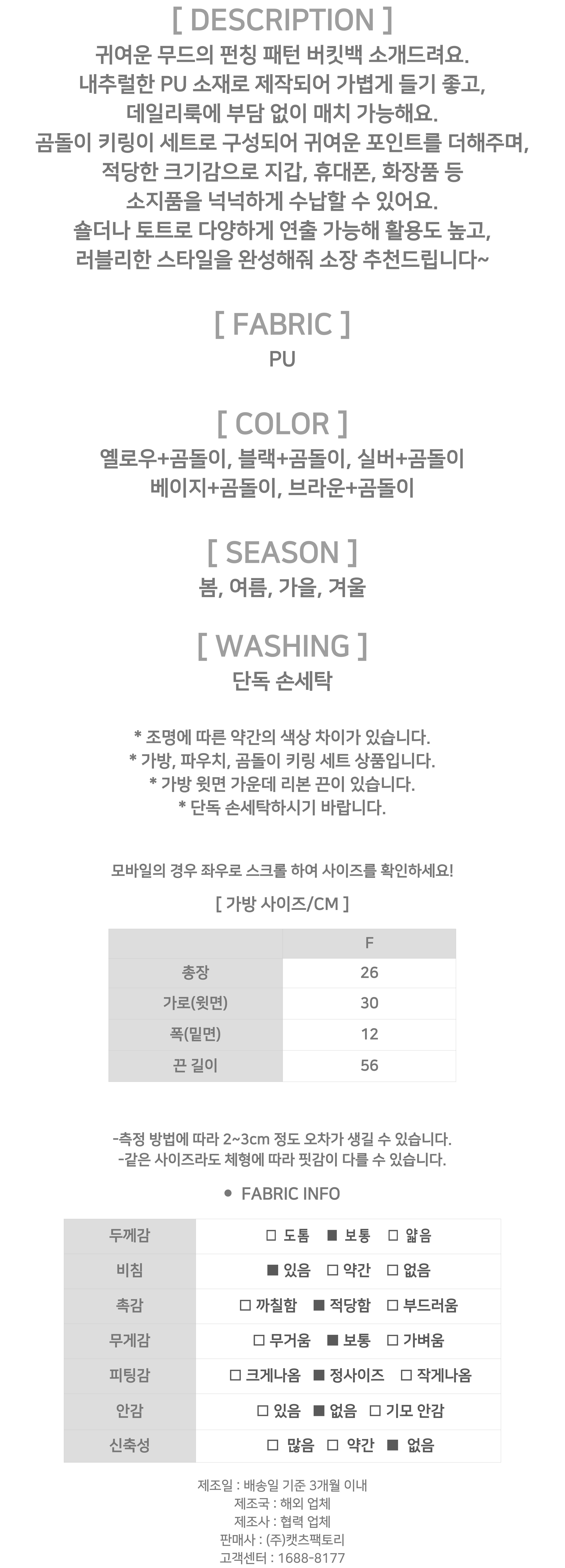 - 제품 사이즈는 측정 방식에 따라 2~3cm의 오차가 있을 수 있으며, 이는 불량의 사유가 되지 않습니다.