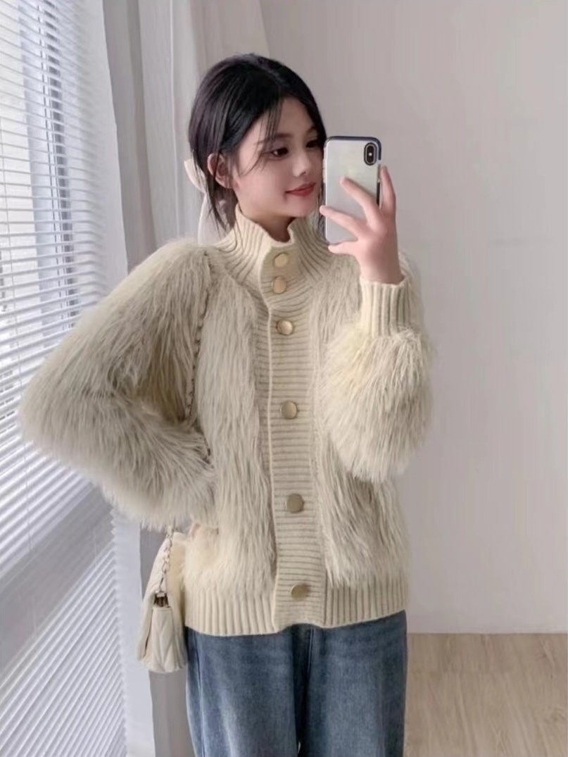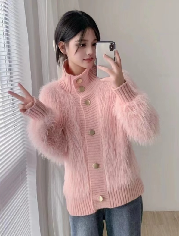 181264 퍼 믹스 하이넥 골드버튼 니트 가디건 29980