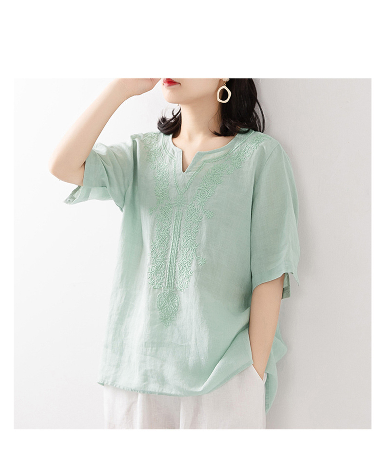 트임 네크라인 자수 코튼 혼방 티셔츠