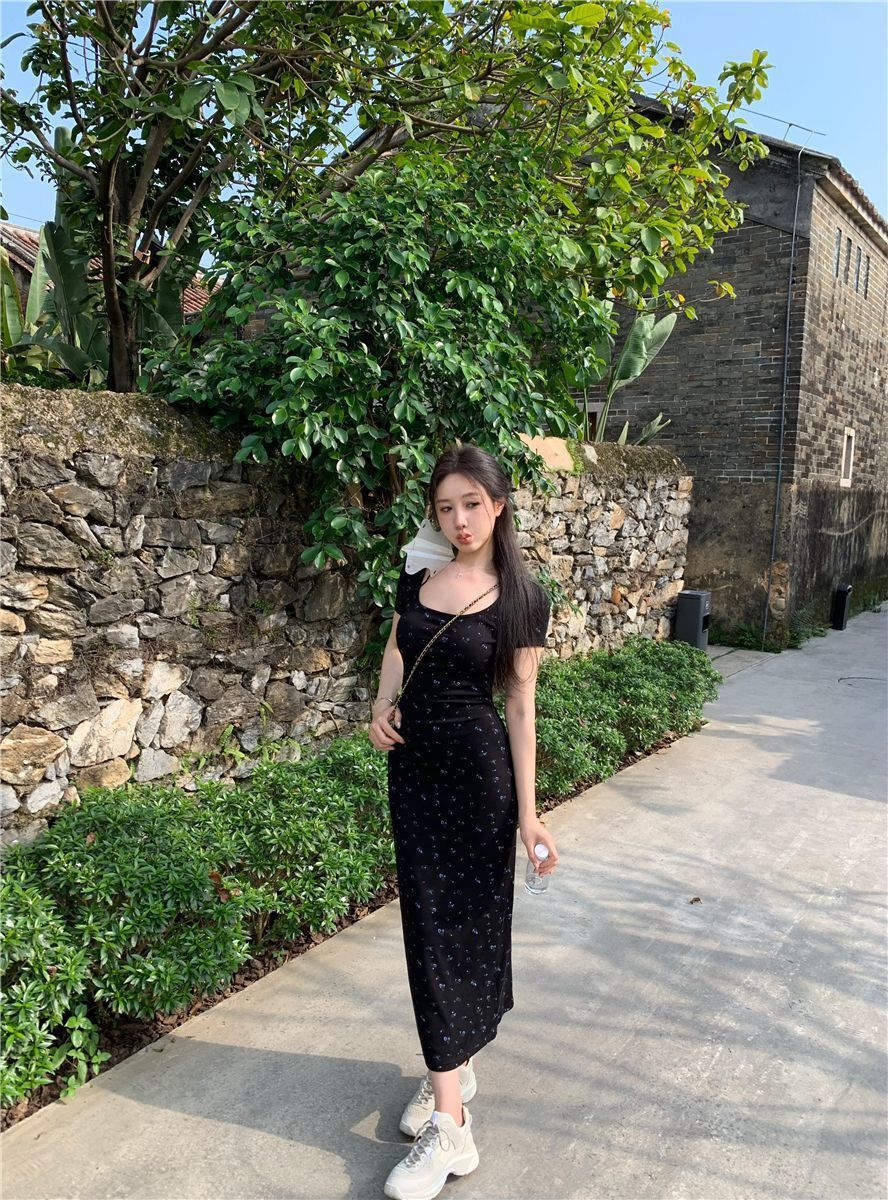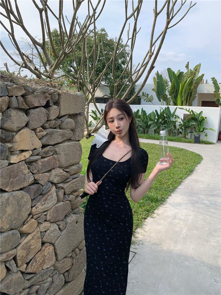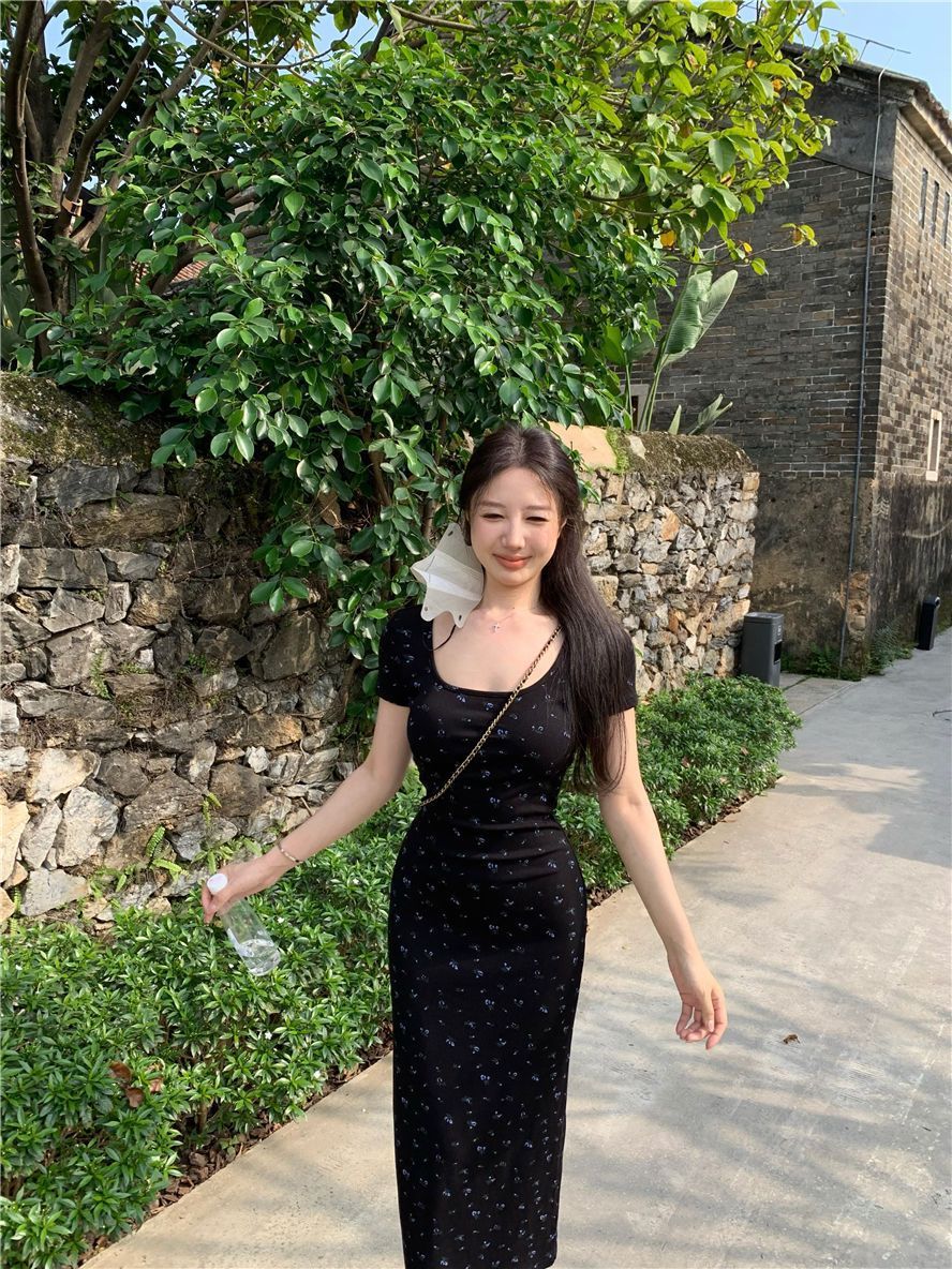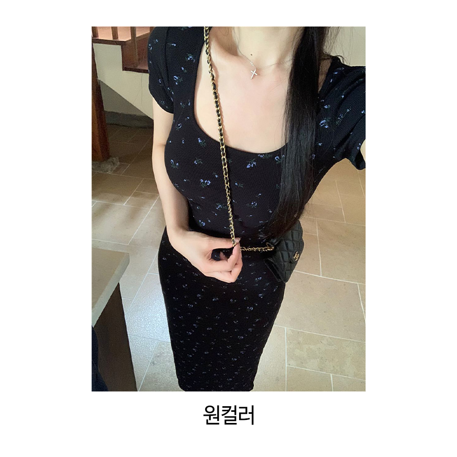 ◈[당일발송] 슬림 골지 블랙 플라워 원피스