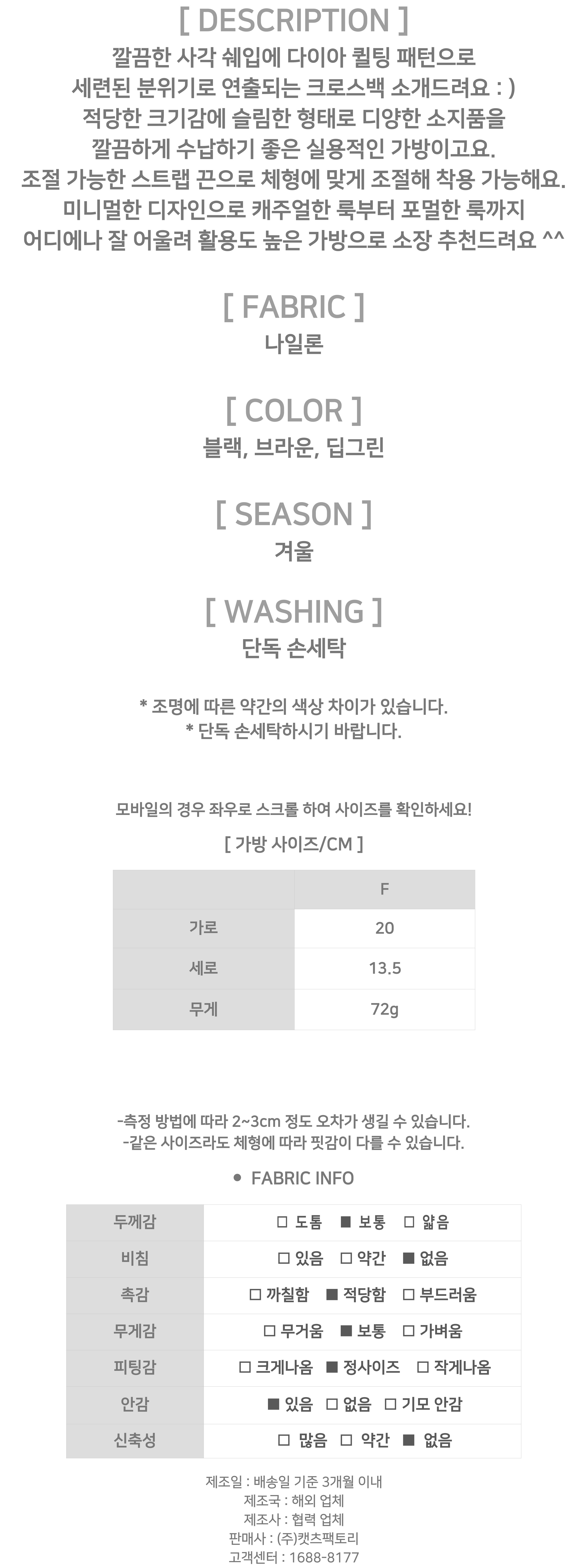 - 제품 사이즈는 측정 방식에 따라 2~3cm의 오차가 있을 수 있으며, 이는 불량의 사유가 되지 않습니다.