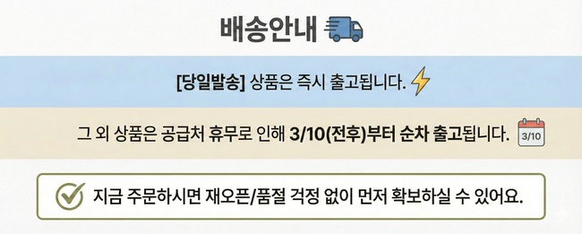 - 평일 오후 4시까지 결제 완료 되어야 하며, 주말과 공휴일 주문건은 다음 업무일에 발송됩니다.