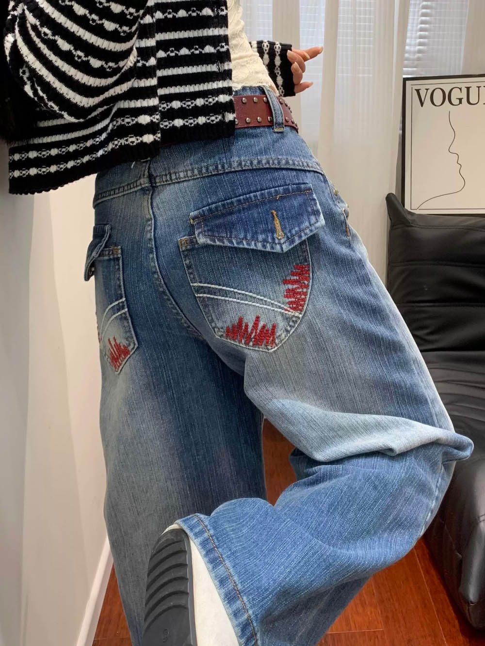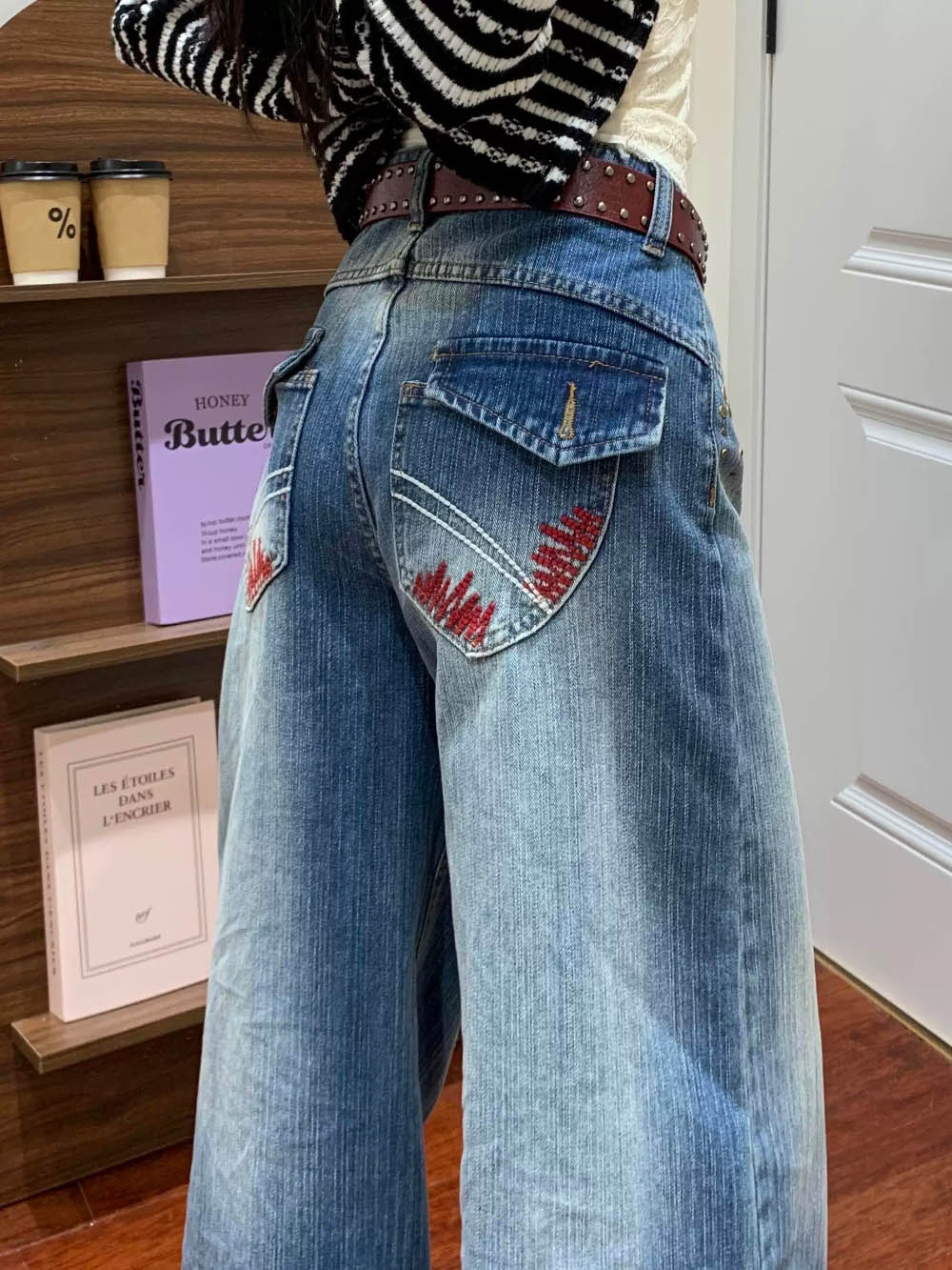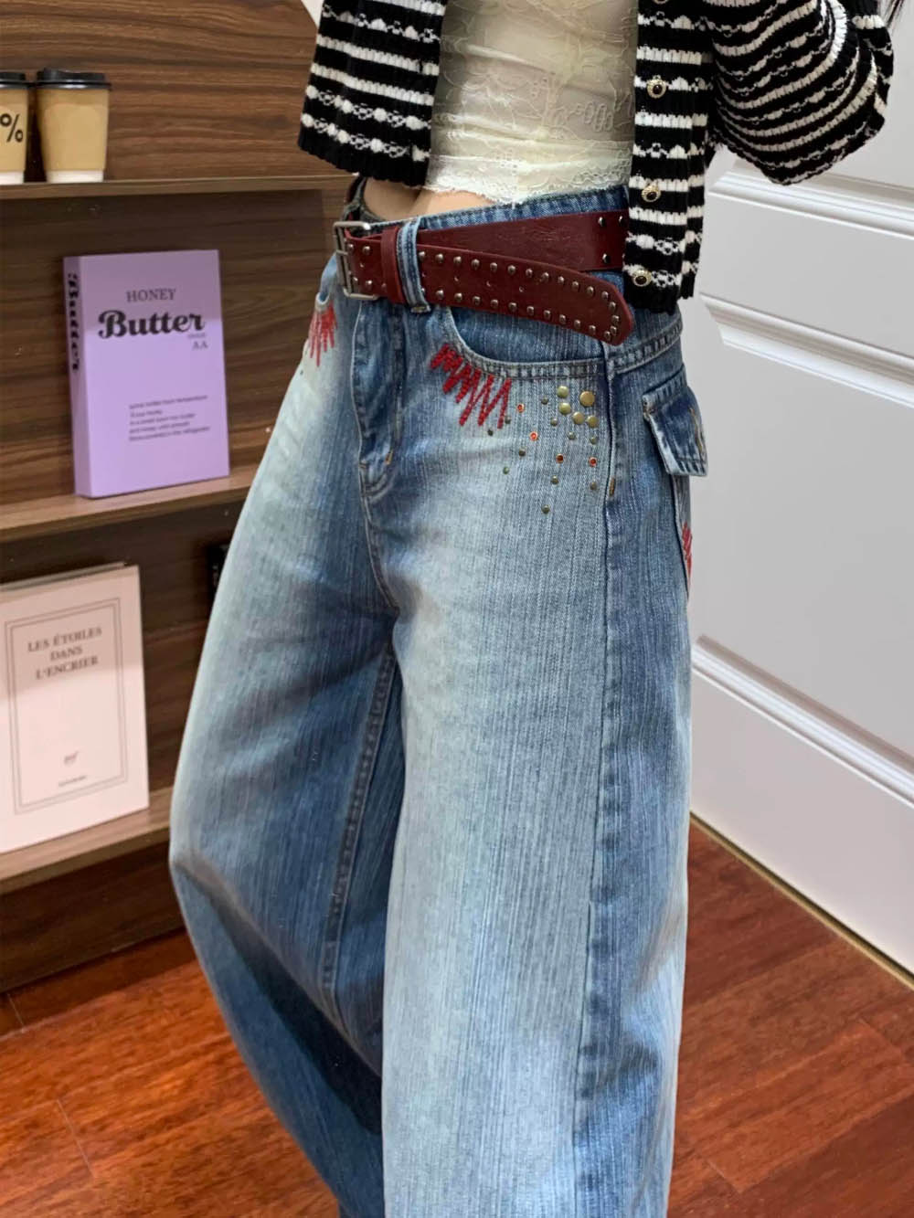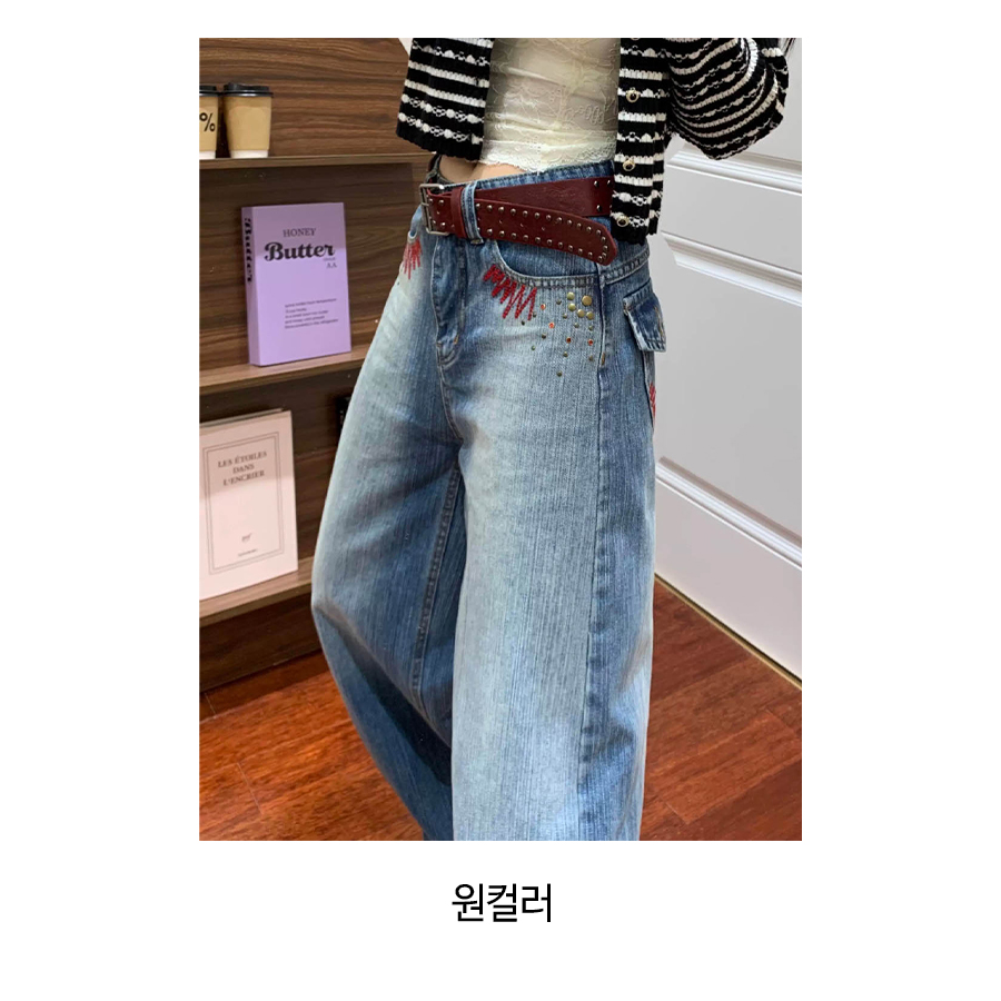 레드 자수 포인트 와이드 데님