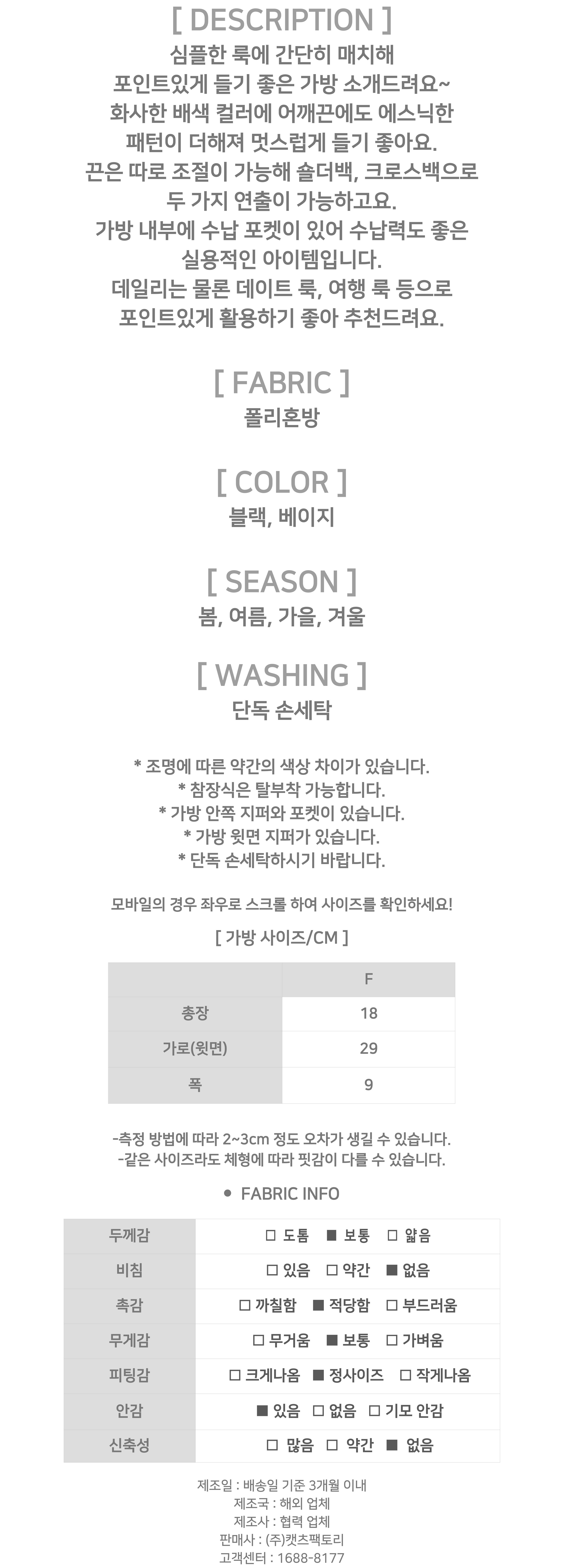 - 제품 사이즈는 측정 방식에 따라 2~3cm의 오차가 있을 수 있으며, 이는 불량의 사유가 되지 않습니다.