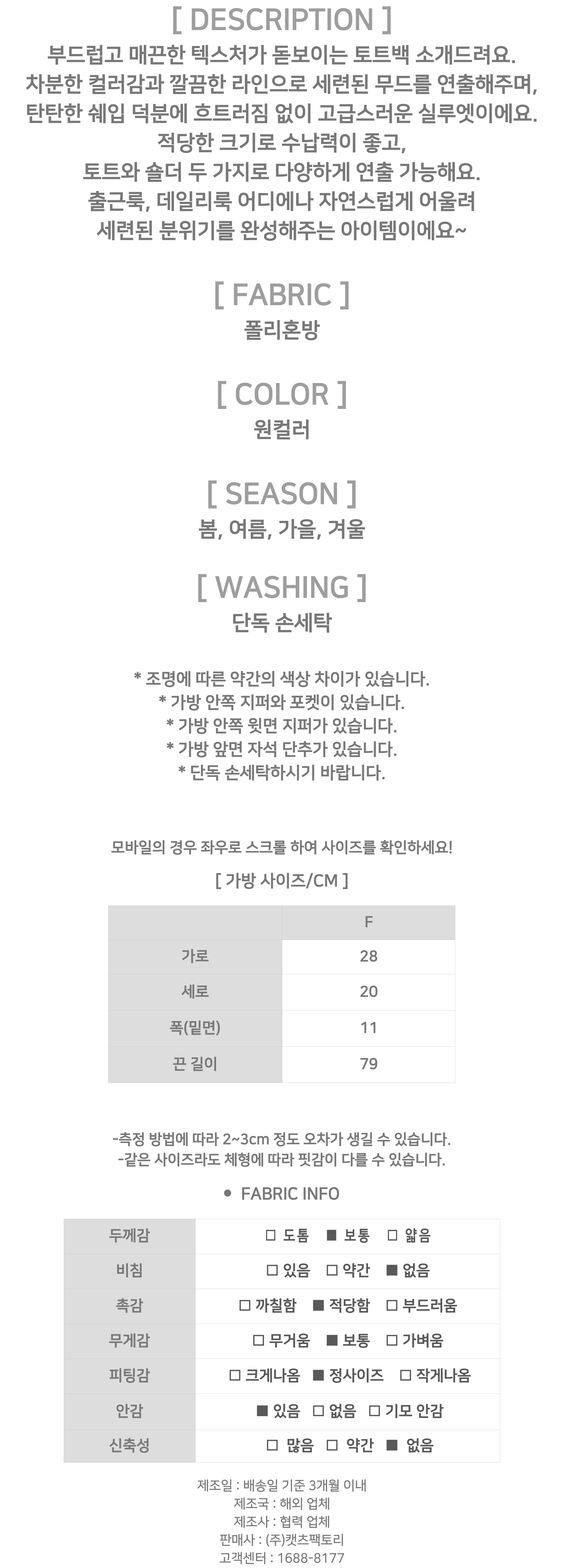 - 제품 사이즈는 측정 방식에 따라 2~3cm의 오차가 있을 수 있으며, 이는 불량의 사유가 되지 않습니다.